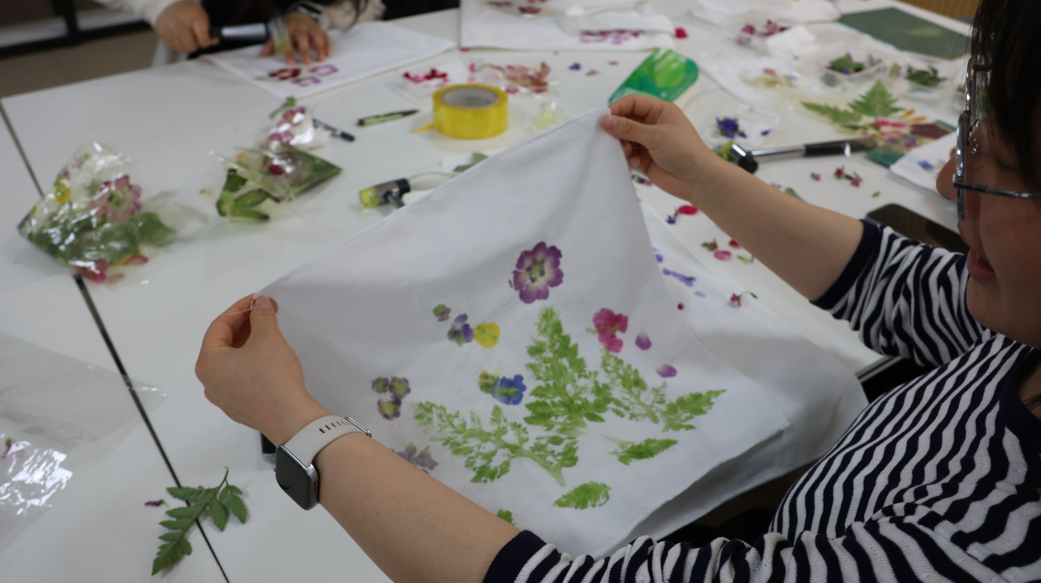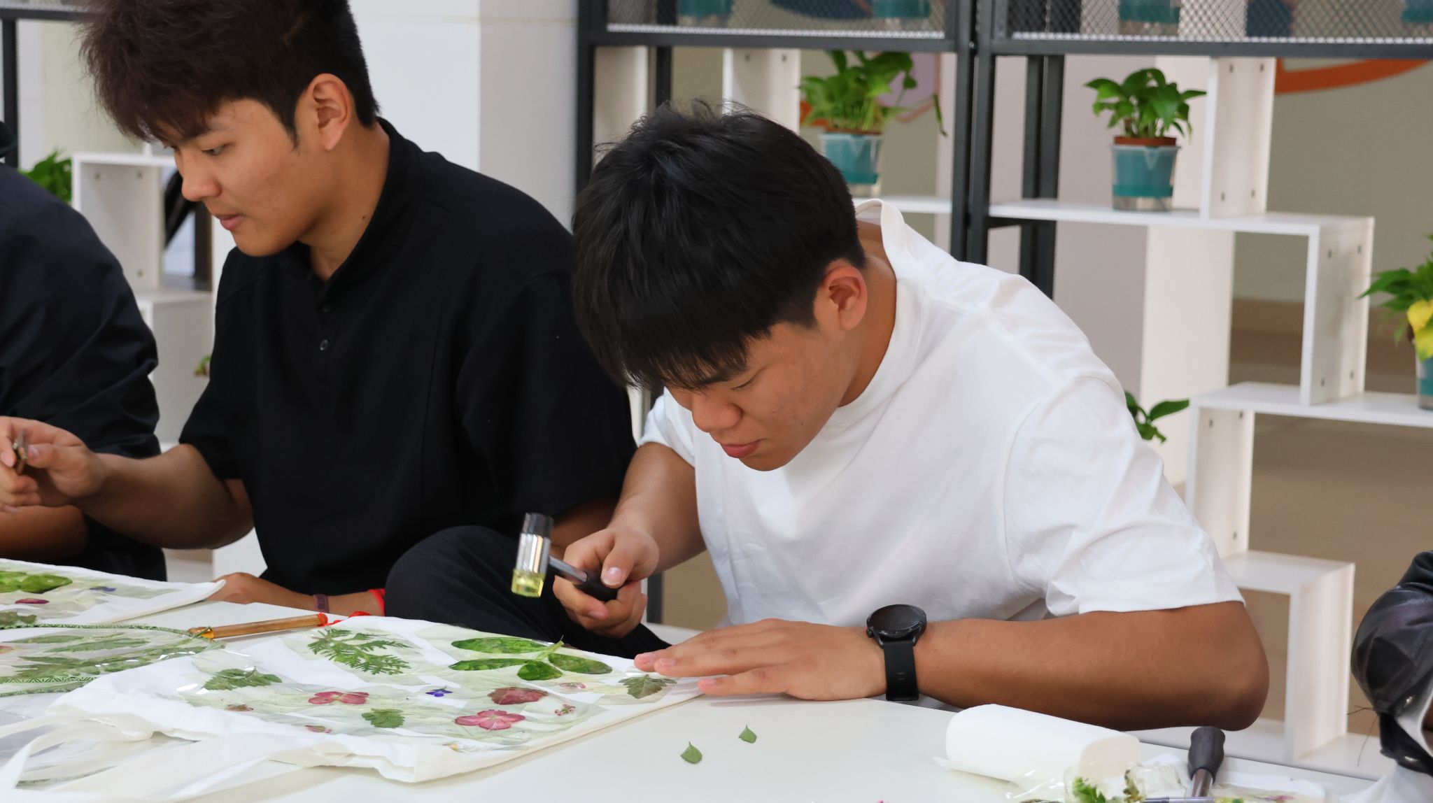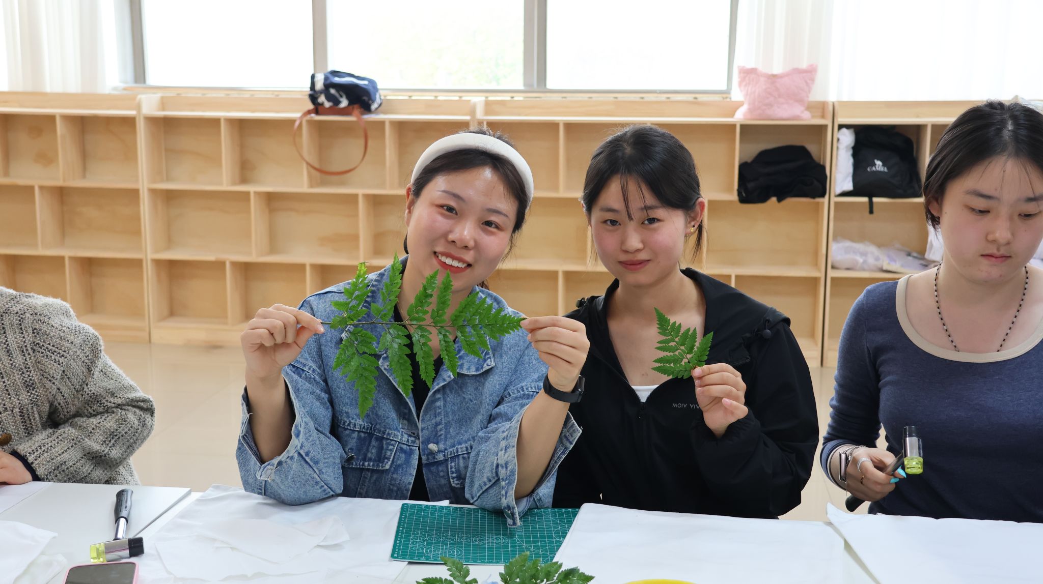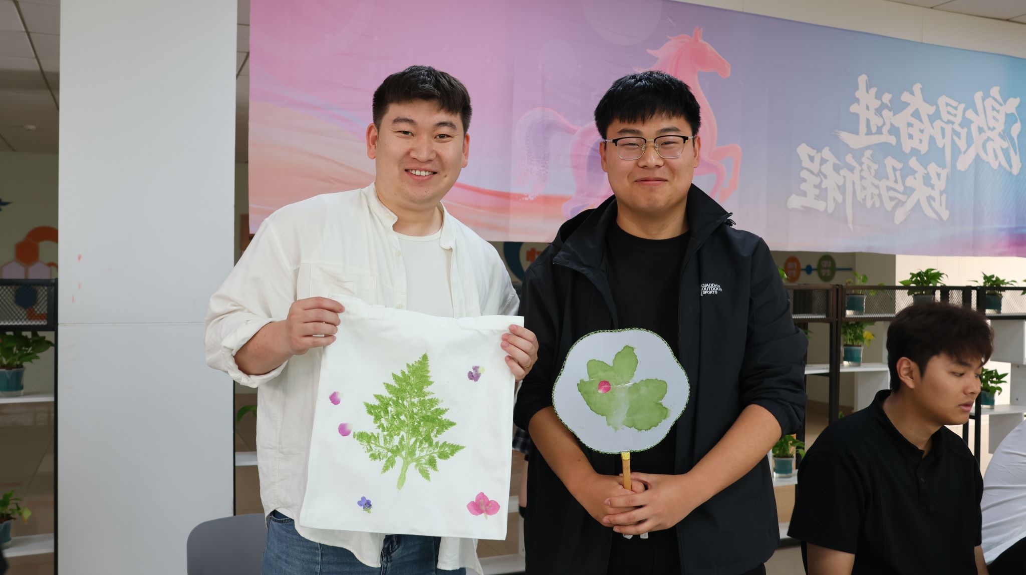 本次活动深度融合医学专业特色与传统拓印技艺,以中药材为媒、以拓印为艺,围绕“科普+体验+互动”展开,在扇子、方巾、帆布包等载体上尽情创作。活动伊始,心理联络员老师结合实物,讲解了石竹花、紫苏叶、薄荷叶等中药材的形态特征、药用功效以及拓印的完整步骤,让大家在触摸、观察、聆听中,感受中医文化的深厚底蕴和非遗技艺的独特魅力。在沉浸式制作环节,师生们纷纷挑选心仪的中药材和创作载体,精心搭配布局,大胆发挥创意,用拓印锤将中药材的自然纹路与个人心意融入作品之中,让每一件作品都成为承载美好与治愈的独特载体。活动最后,同学们手持作品相互展示、交流创作感悟,并主动将作品赠予身边的同学或辅导员,附上暖心寄语,用一份份真诚的祝福传递温暖与力量,在互动中增进情谊、滋养心灵。